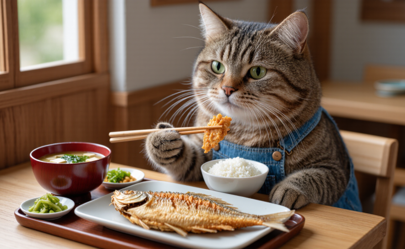画像生成AIがアジフライを理解しないため、街の定食屋で魚の揚げ物を食べるキジトラを、今回のアイキャッチ画像とせねばなりませんでした😓